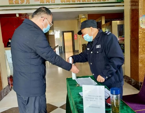 4月1日11:30,記者在位于咸寧大道泉塘轉(zhuǎn)盤附近的我的港灣酒店發(fā)現(xiàn),該酒店大廳安排有專人負(fù)責(zé)測溫登記,顧客要經(jīng)過測溫、消毒并實名登記后才能進(jìn)店消費(fèi)。