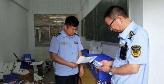 執(zhí)法人員檢查學(xué)校倉庫現(xiàn)場?徐渝攝