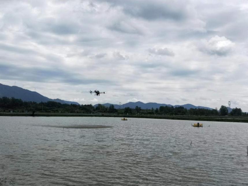 “放料、調(diào)試、啟動(dòng)……”在“稻蝦蟹鱉”基地,一架無(wú)人機(jī)正在水面上空快速飛行,生態(tài)飼料從“機(jī)肚”中旋轉(zhuǎn)而出?!拔覀円郧拔桂B(yǎng)龍蝦、螃蟹、土鱉,只能沿池塘四周撒一圈,中間不會(huì)撒料。這一款無(wú)人機(jī)正好有掃邊模式,大大提高了效率?!笔嫠嫉卣f(shuō)。