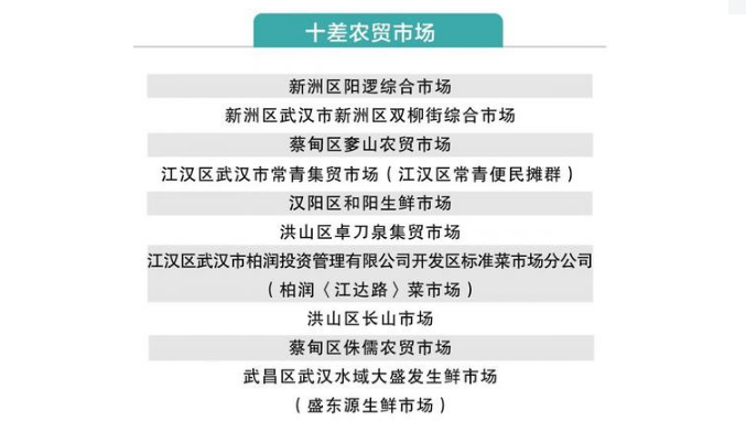 十差農貿市場名單分別是:新洲區(qū)陽邏綜合市場、新洲區(qū)武漢市新洲區(qū)雙柳街綜合市場、蔡甸區(qū)奓山農貿市場、江漢區(qū)武漢市常青集貿市場(江漢區(qū)常青便民攤群)、漢陽區(qū)和陽生鮮市場、洪山區(qū)卓刀泉集貿市場、江漢區(qū)武漢市柏潤投資管理有限公司開發(fā)區(qū)標準菜市場分公司(柏潤<江達路>菜市場)、洪山區(qū)長山市場、蔡甸區(qū)侏儒農貿市場、武昌區(qū)武漢水域大盛發(fā)生鮮市場(盛東源生鮮市場)。(陶常寧)