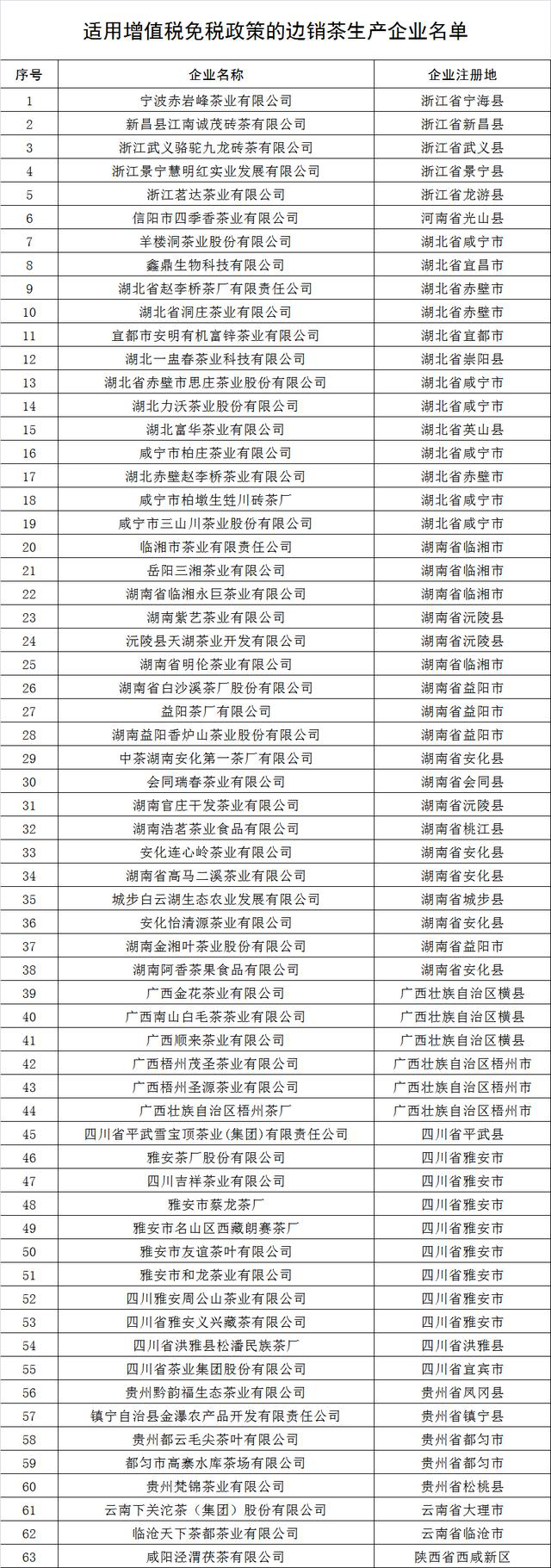湖北13家企業(yè)適用財政部關于邊銷茶免增值稅政策,其中包括:羊樓洞茶業(yè)股份有限公司、鑫鼎生物科技有限公司、湖北省趙李橋茶廠有限責任公司、湖北省洞莊茶業(yè)有限公司、宜都市安明有機富鋅茶業(yè)有限公司、湖北一盅春茶業(yè)科技有限公司、湖北省赤壁市思莊茶業(yè)股份有限公司、湖北力沃茶業(yè)股份有限公司、湖北富華茶業(yè)有限公司、咸寧市柏莊茶業(yè)有限公司、湖北赤壁趙李橋茶業(yè)有限公司、咸寧市柏墩生甡川磚茶廠、咸寧市三山川茶業(yè)股份有限公司。
