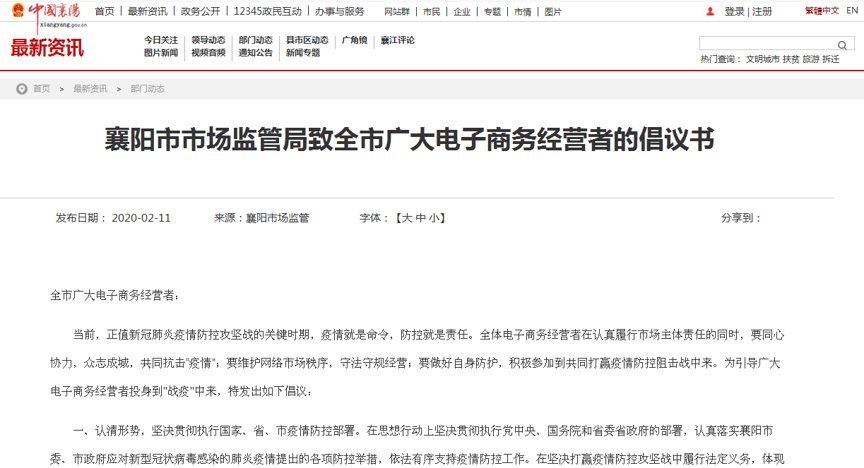 中國食品安全網(wǎng)訊(熊源?劉玉成?許超?記者胡毅)2?月?11?日,為深入貫徹落實(shí)黨中央、國務(wù)院關(guān)于防控新型冠狀病毒感染的肺炎疫情的指示精神,全力以赴防控新冠肺炎疫情,襄陽市市場監(jiān)管管理局發(fā)出引導(dǎo)廣大電子商務(wù)經(jīng)營者投身“戰(zhàn)疫”的倡議書。