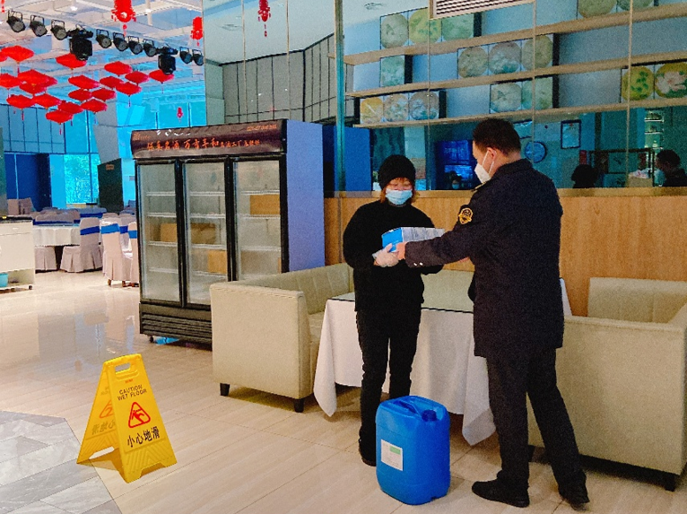 在知道洪山區(qū)餐飲服務(wù)單位醉江月南湖店防護物資短缺的情況后,該所立即通過洪山市場監(jiān)督管理局協(xié)調(diào)防護用品,贈送給醉江月南湖店一批口罩、消毒水、手套、護目鏡。
