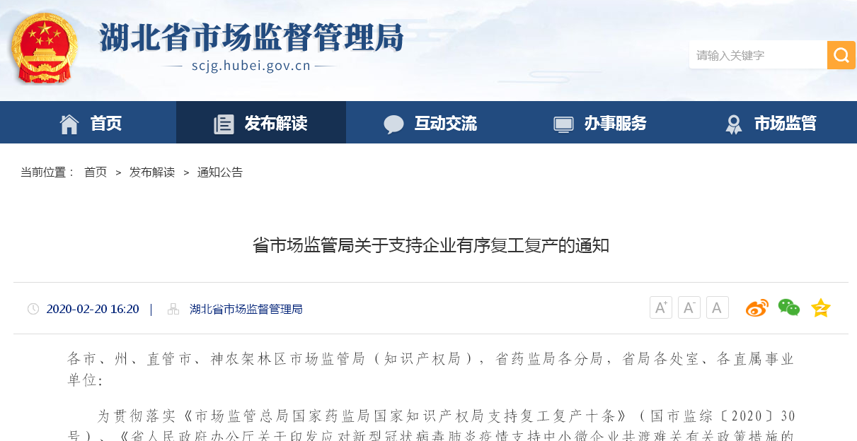中國食品安全網(wǎng)訊(熊源?曹本鋒?曾里?記者胡毅)近日,為進一步加強新冠肺炎疫情科學防控,做好保供應、保秩序、保安全、保價格、保質(zhì)量工作,湖北省市場監(jiān)管局出臺支持企業(yè)有序復工復產(chǎn)的九條措施,充分發(fā)揮市場監(jiān)管職能作用,支持企業(yè)復工復產(chǎn)、共度難關。這些措施涵蓋行政許可網(wǎng)上辦理、建立應急審批通道、延長行政許可期限、依法監(jiān)管審慎執(zhí)法等方面。