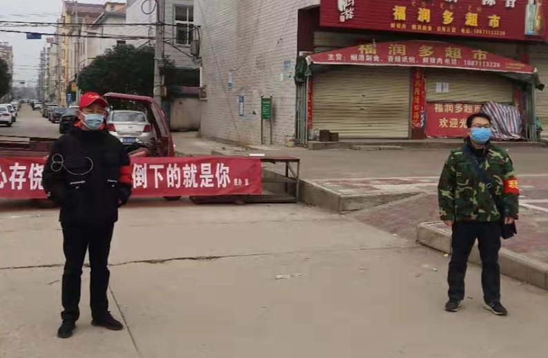 疫情暴發(fā)后,廣水市人社局干部李俊杰等?4?名志愿者值守在廣水城區(qū)北正街工行宿舍進(jìn)出口。