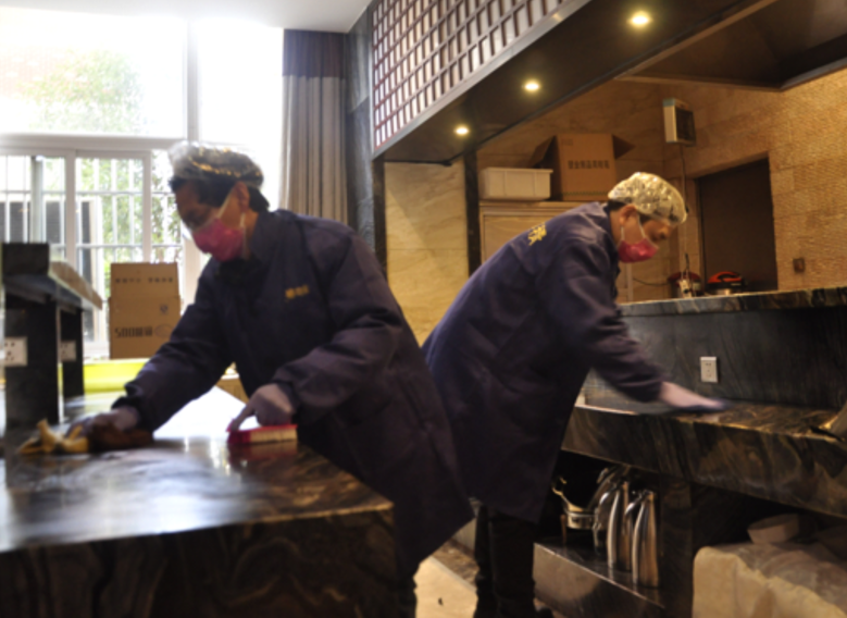 山水時尚酒店廚房工作人員正在對分菜臺進行日常消毒