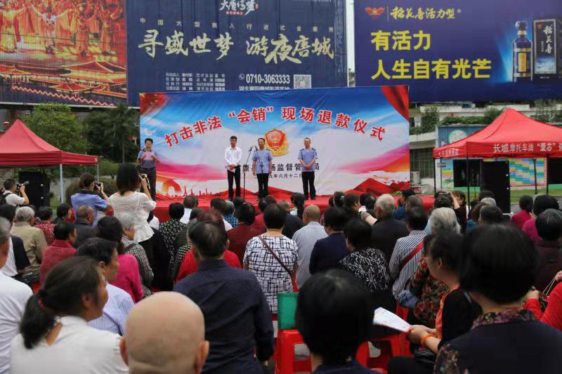 中國(guó)食品安全網(wǎng)訊 (記者熊源 胡毅)12日早上,襄陽(yáng)??底限睆V場(chǎng)上舉行打擊非法“會(huì)銷(xiāo)”現(xiàn)場(chǎng)退款儀式,被虛假宣傳欺騙購(gòu)買(mǎi)保健品的64名老人及親屬近兩百人從保康縣市場(chǎng)監(jiān)管局執(zhí)法人員手中拿回被騙的錢(qián)款18.41萬(wàn)元。