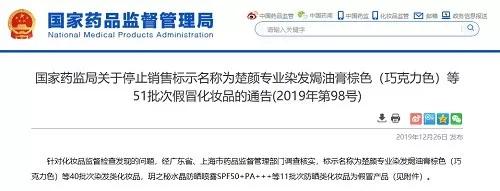 中國(guó)食品安全網(wǎng)訊(記者?胡毅)12月26日,國(guó)家藥品監(jiān)督管理局發(fā)布《關(guān)于停止銷(xiāo)售標(biāo)示名稱(chēng)為楚顏專(zhuān)業(yè)染發(fā)焗油膏棕色(巧克力色)等51批次假冒化妝品的通告(2019年第98號(hào)) 》。