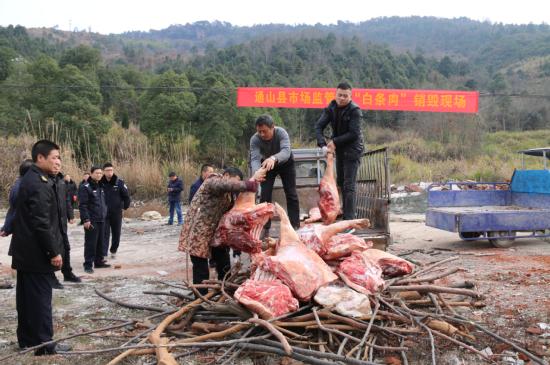中國食品安全網(wǎng)訊(石義濤?李上上)?1月8日,咸寧市通山縣市場監(jiān)督管理局聯(lián)合通山縣公安局、通山縣農(nóng)業(yè)農(nóng)村局,在通羊城郊集中銷毀了450公斤未加蓋動(dòng)物檢疫合格印章以及肉品檢驗(yàn)合格印章的豬肉(簡稱“白條肉”)。通山縣市場監(jiān)管局黨組書記、局長宋驕陽點(diǎn)火并監(jiān)督了銷毀過程。