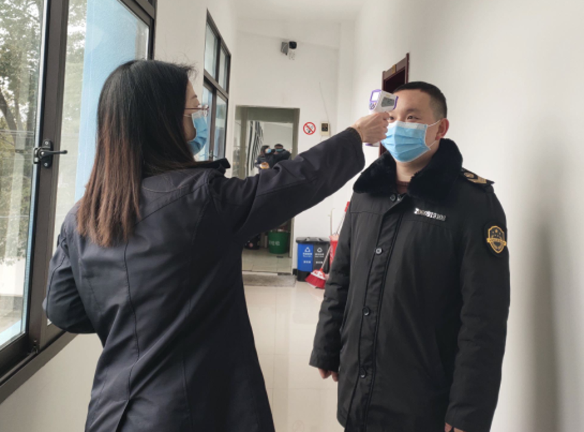1?月?31?日?8:10,黃花監(jiān)管所全員到崗,上班第一步,全體工作人員相互幫助測量體溫,一天的工作從此起彼伏的“體溫正?!甭曋欣_帷幕。