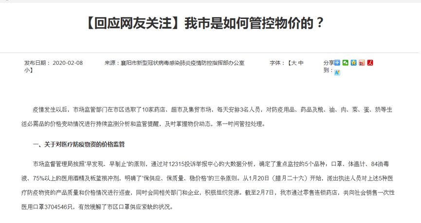 中國(guó)食品安全網(wǎng)訊(熊源?記者胡毅)口罩、蔬菜等商品價(jià)格如何管控?違法狩獵、交易野生動(dòng)物等行為,如何處置?2?月?8?日,襄陽市新型冠狀病毒感染的肺炎疫情防控指揮部辦公室就當(dāng)前網(wǎng)友較為關(guān)注的問題在襄陽市人民政府門戶網(wǎng)站和襄陽日?qǐng)?bào)等平臺(tái)做了回應(yīng)。